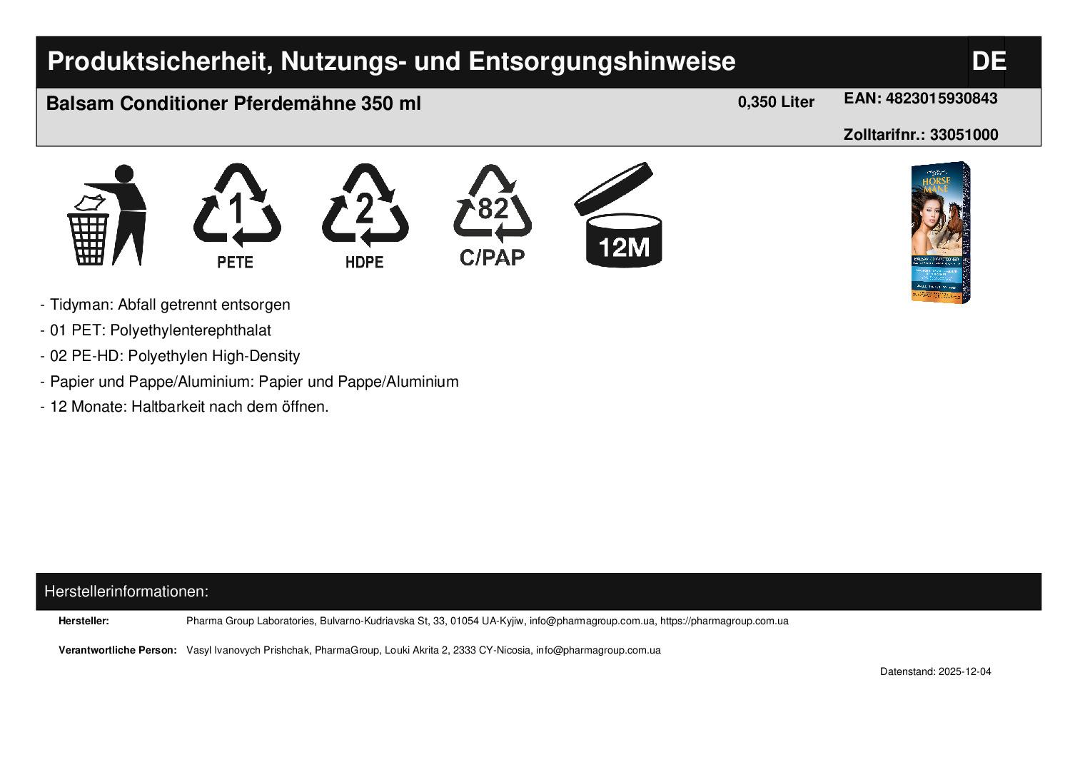 Balsam Conditioner Horse Mane Haarspülung Keratin Lanolin Collagen 350 ml