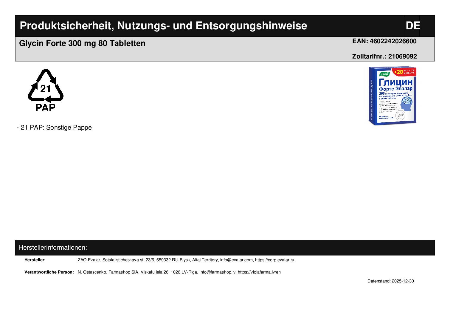 Glycin Forte Evalar 300 mg 80 Tabletten Vitamin B1, B6, B12