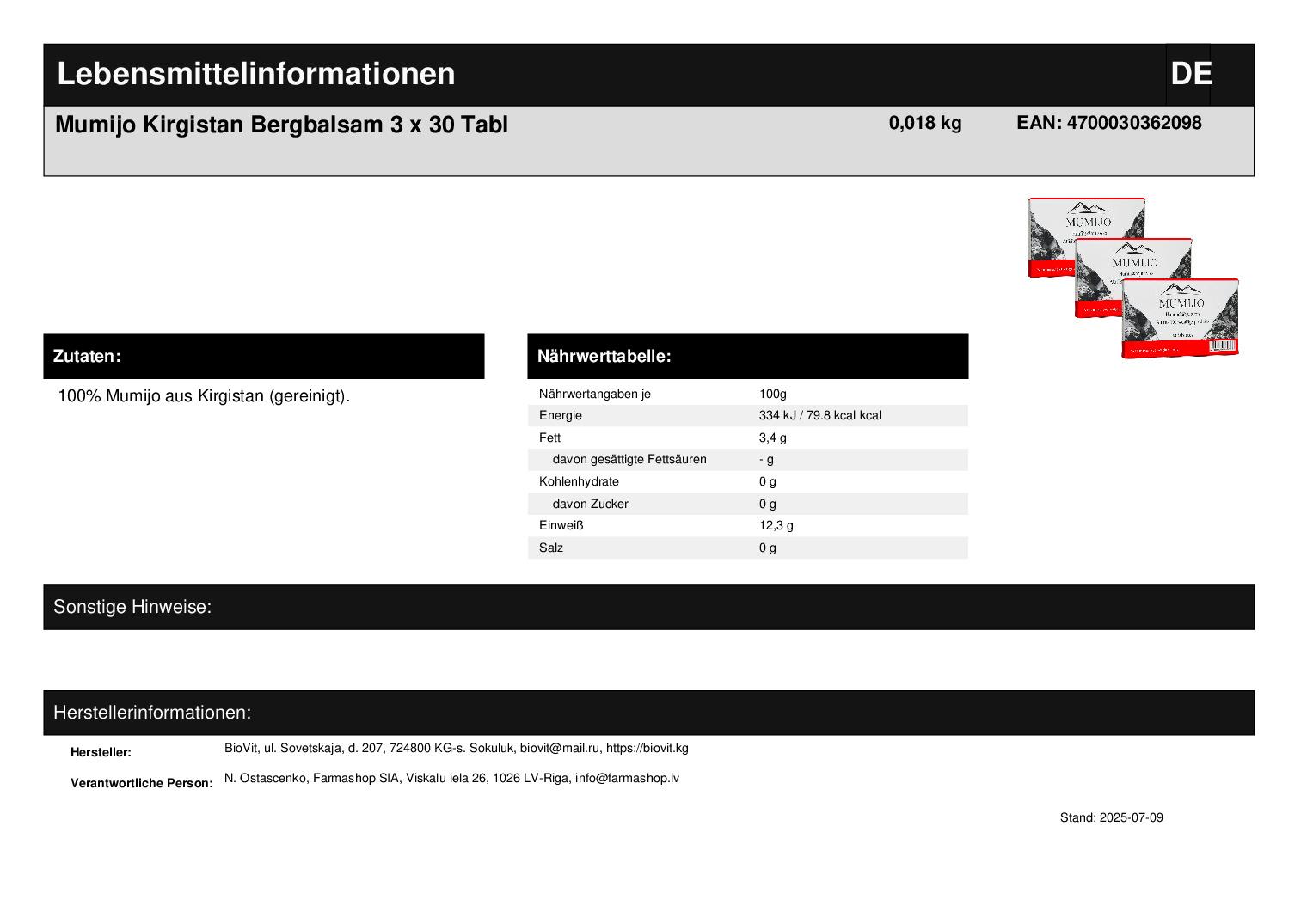 Mumijo ist ein pflanzlicher Huminstoff, der in den Bergregionen Asiens gesammelt wird. Mumijo hat antioxidative Eigenschaften, unterstützt eine ausgewogene Funktion des Immunsystems und fördert die normale Gesundheit von Knochen und Gelenken.
