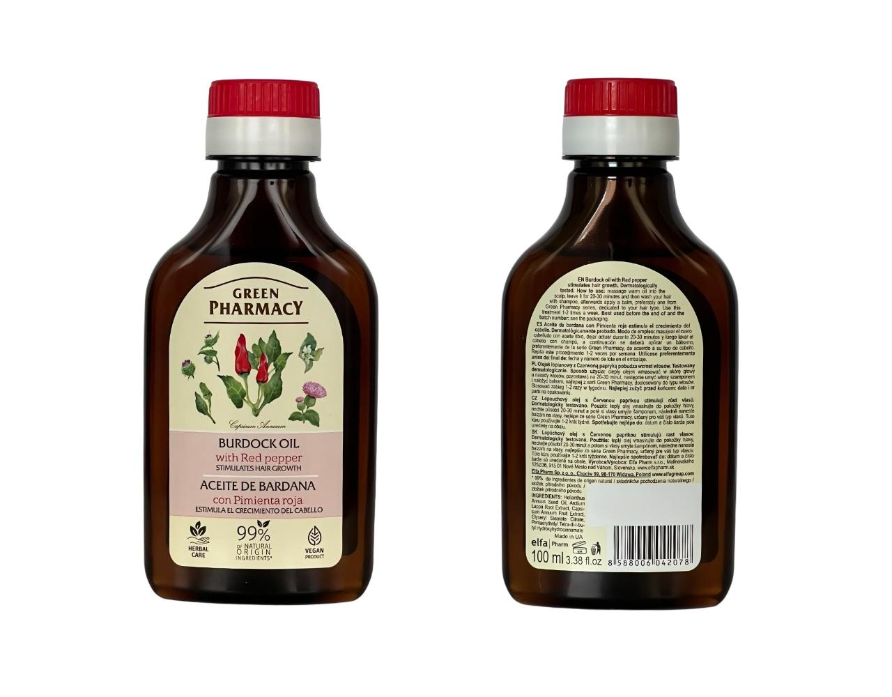 Klettenöl mit rotem Pfeffer, das das Haarwachstum stimuliert. Klettenwurzelöl stärkt die Haarstruktur, nährt ihre Zwiebeln, stimuliert das Wachstum, reguliert die Talgdrüsen. Es wirkt entzündungshemmend und antischuppig. Roter Pfeffer stimuliert die Mikrozirkulation der Kopfhaut, erleichtert das Eindringen der Wirkstoffe des Öls in die Haarwurzeln. Das Haar wird dicker und kräftiger.