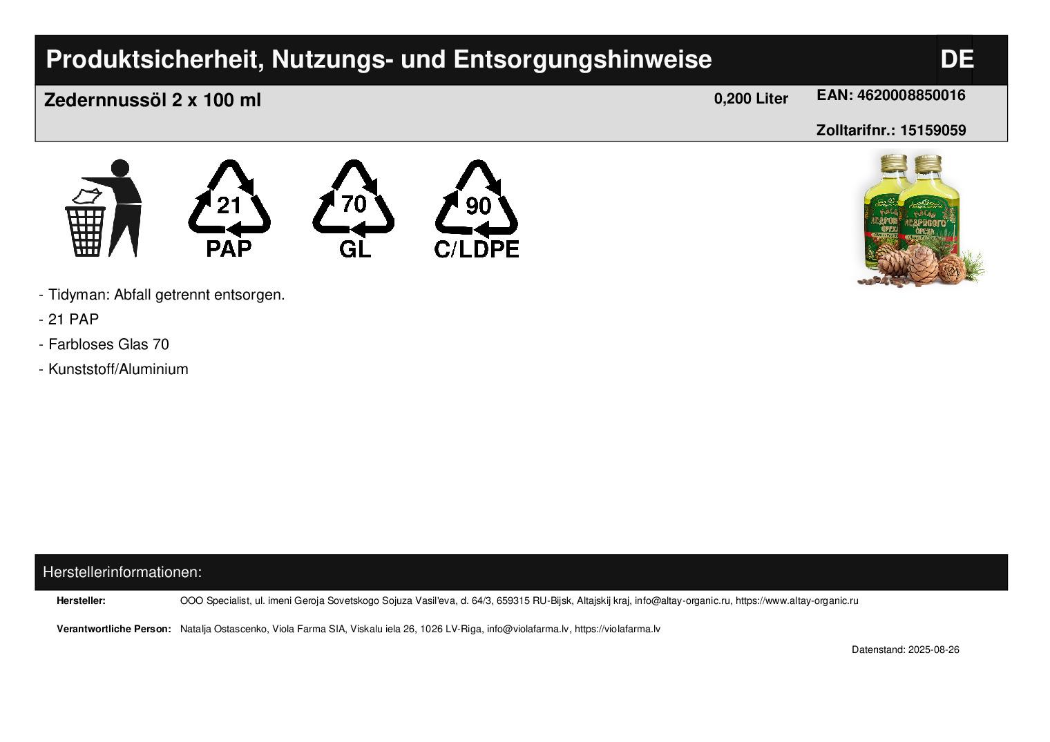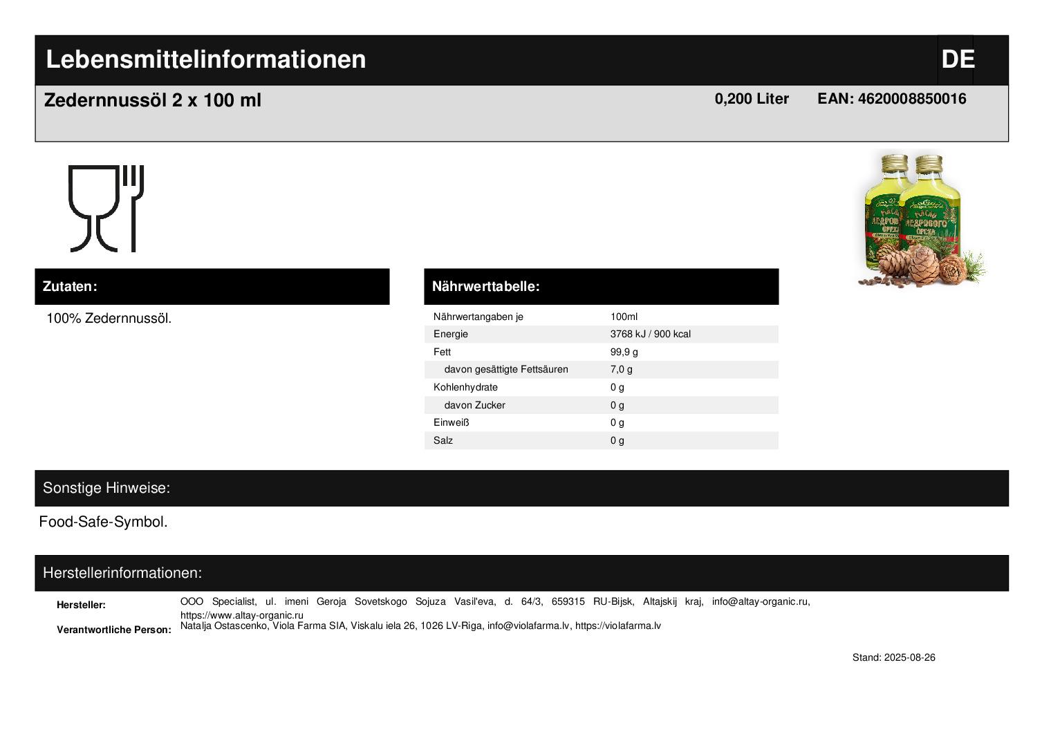 Das Öl aus der sibirischen Zedernnuss, verfügt über eine einzigartige Struktur und Zusammensetzung fettlöslicher, biologischer, aktiver Substanzen. Zedernnussöl trägt zur Stabilisierung des menschlichen Organismus bei und verbessert das Blut und sorgt für die Heilung vieler Krankheiten.