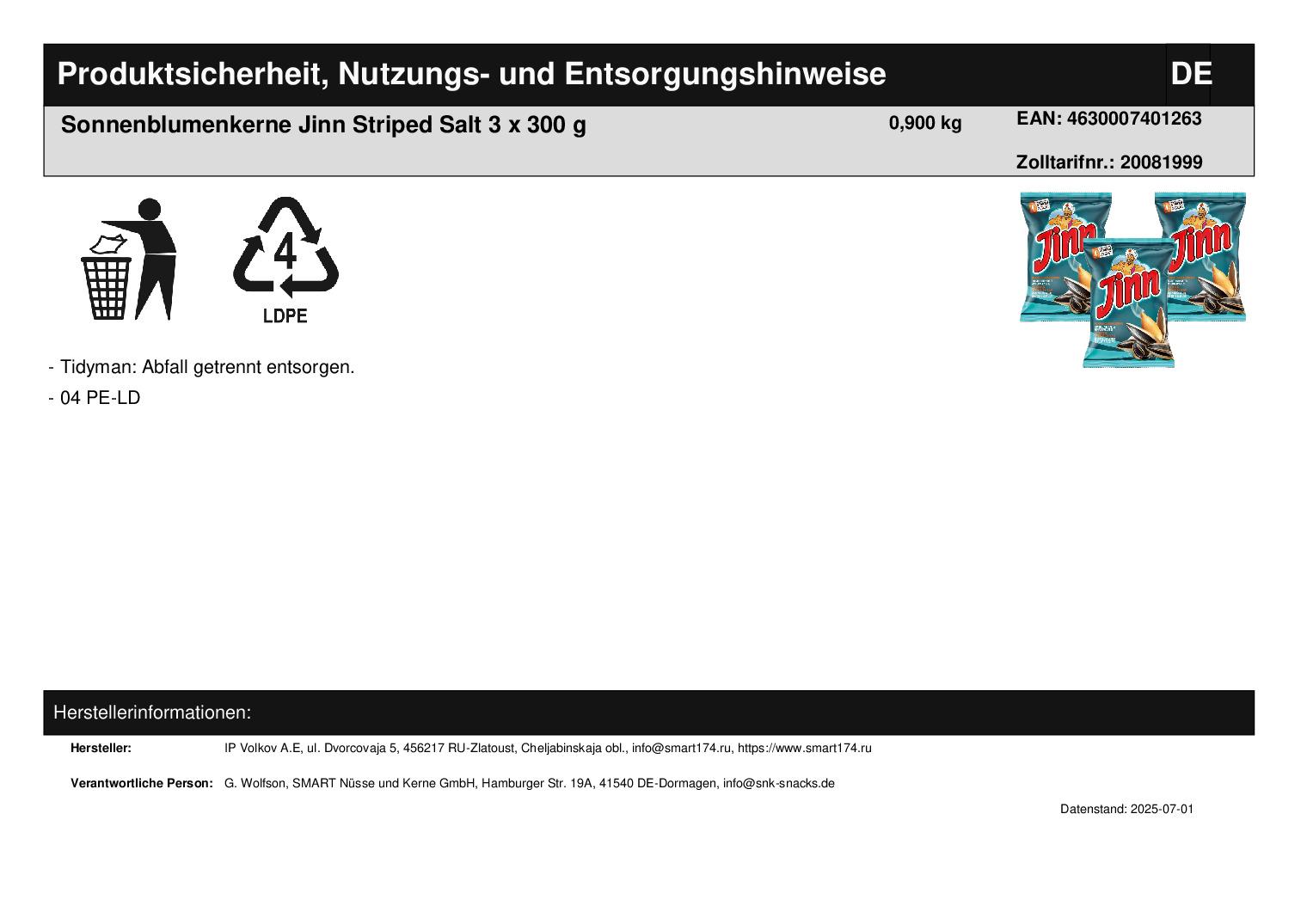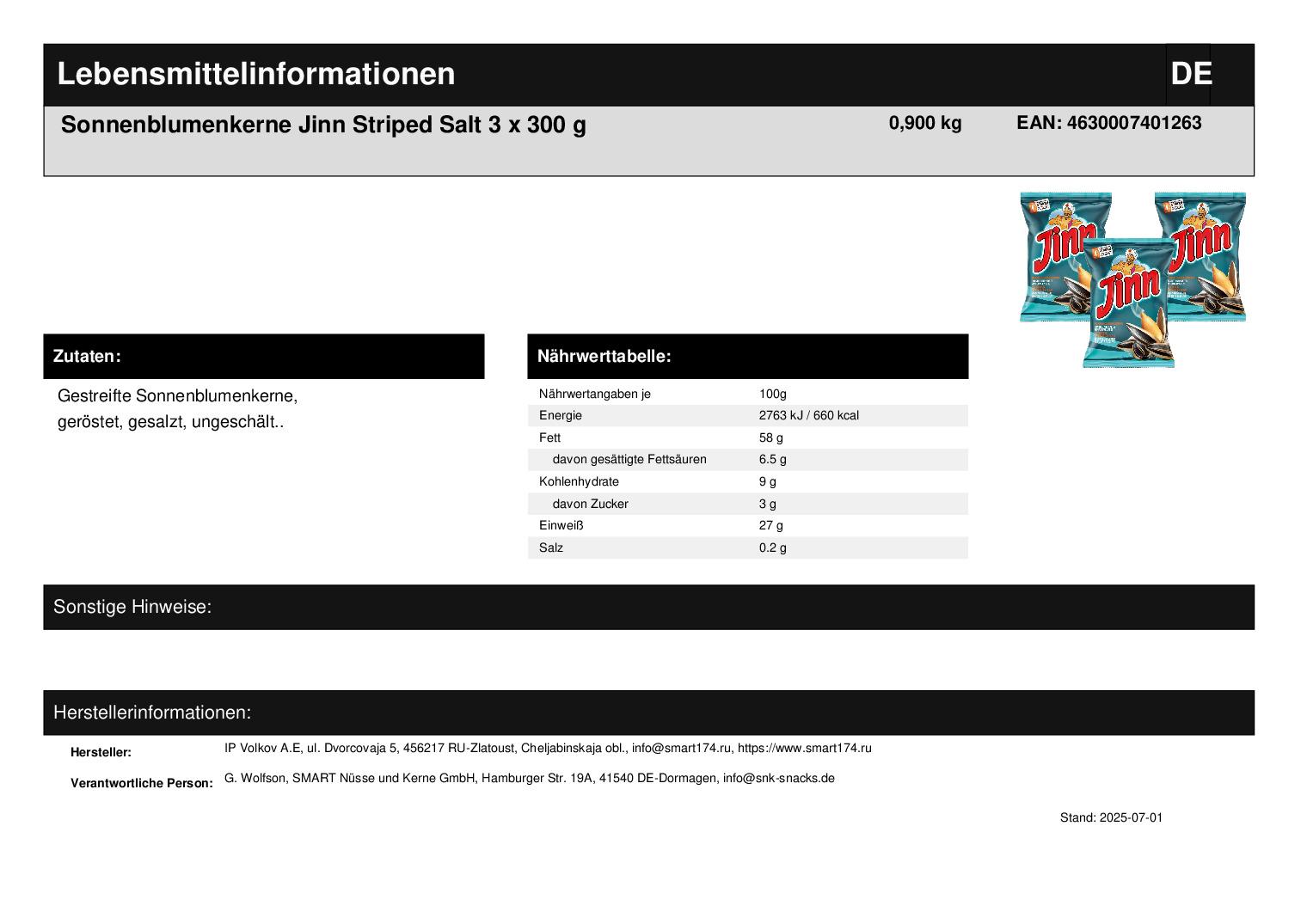 Es handelt sich um kalibrierte gestreifte Sonnenblumenkerne, die aus der hochwertigsten Süßwaren-Sonnenblumensorte hergestellt werden. Geröstete Sonnenblumenkerne haben einen unübertroffenen Geschmack, enthalten viele essentielle Aminosäuren, Vitamine der Gruppe B, C, D, E, Karotin. Die gebratenen Sonnenblumenkerne der Marke Jinn unterscheiden sich deutlich von anderen Arten gebratener Sonnenblumenkerne.