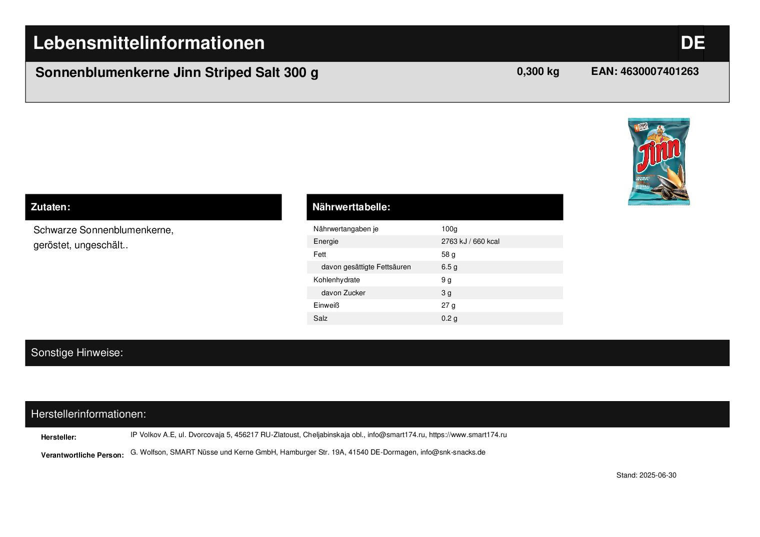 Es handelt sich um kalibrierte gestreifte Sonnenblumenkerne, die aus der hochwertigsten Süßwaren-Sonnenblumensorte hergestellt werden. Geröstete Sonnenblumenkerne haben einen unübertroffenen Geschmack, enthalten viele essentielle Aminosäuren, Vitamine der Gruppe B, C, D, E, Karotin. Die gebratenen Sonnenblumenkerne der Marke Jinn unterscheiden sich deutlich von anderen Arten gebratener Sonnenblumenkerne.